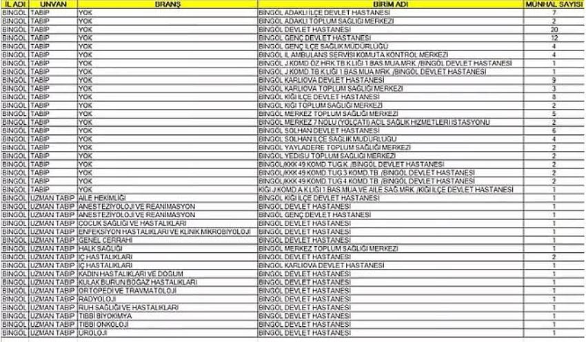 Sağlık Bakanlığı merkezi atama ile Bingöl’e 119 hekim ve uzman hekim ataması için kadro açtı. Yeni açılan kadrolar İl Sağlık Müdürlüğü sosyal medya hesabından duyuruldu. Buna göre Bingöl Merkez Devlet Hastanesi, Adaklı İlçe Devlet Hastanesi, Genç Devlet Hastanesi, Genç İlçe Sağlık Müdürlüğü, Bingöl İl Ambulans Servisi Komuta Kontrol Merkezi, Karlıova Devlet Hastanesi, Karlıova Toplum Sağlığı Merkezi, Kiğı İlçe Devlet Hastanesi, Bingöl Kiğı Toplum Sağlığı Merkezi, Bingöl Merkez Toplum Sağlığı Merkezi, Bingöl Merkez 7 No’lu (Yolçatı) Acil Sağlık Hizmetleri İstasyonu, Solhan Devlet Hastanesi, Solhan İlçe Sağlık Müdürlüğü, Yayladere Toplum Sağlığı Merkezi, Yedisu Toplum Sağlığı Merkezi, Kiğı İlçe Devlet Hastanesi, Çocuk Sağlığı ve Hastalıkları, Kadın Hastalıkları ve Doğum Hastanesine 119 hekim için kadro açıldığı duyuruldu.