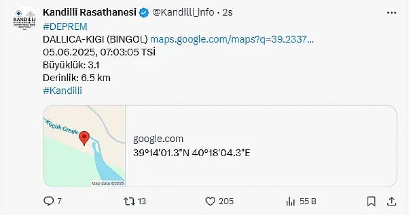 Kandilli Rasathanesi merkez üssü Kiğı Dallıca Köyü olan 3.1 şiddetinde deprem meydana geldiğini açıkladı. Sosyal medya hesabı üzerinden paylaşım yapan Kandilli, saat 07.03'te meydana gelen depremin yerin 6.5 km altında gerçekleştiğini de belirtti. Bölgede son günlerde 40'tan fazla deprem meydana geldi. |